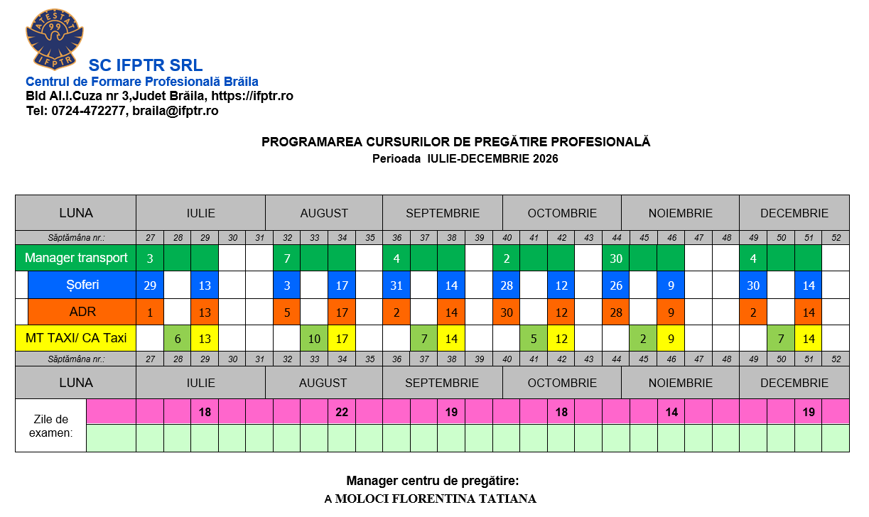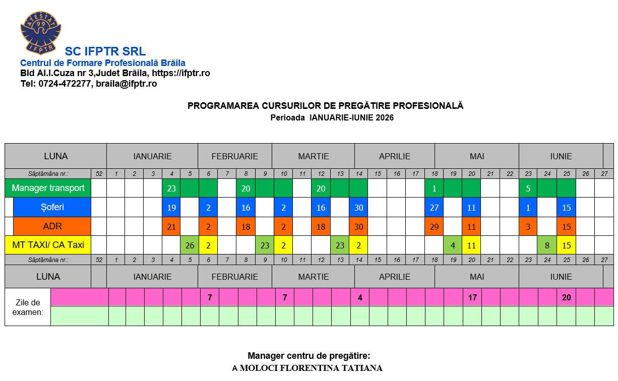 Centrul de Formare Profesională în Transporturi Rutiere IFPTR Brăila organizează cursuri de pregătire profesională în vederea atestării profesionale în vederea desfasurarii urmatoarelor activități :