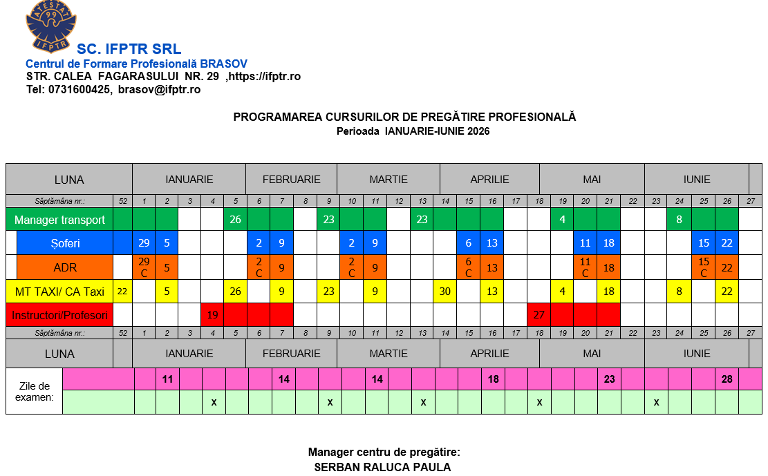Centrul de Formare Profesională în Transporturi Rutiere IFPTR Brașov organizează cursuri de pregătire profesională în vederea atestării profesionale în vederea desfasurarii urmatoarelor activități :