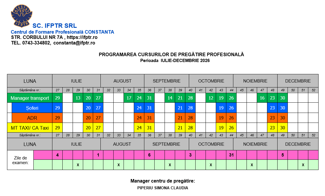 Centrul de Formare Profesională în Transporturi Rutiere IFPTR Constanţa organizează cursuri de pregătire profesională în vederea atestării profesionale în vederea desfasurarii urmatoarelor activități :