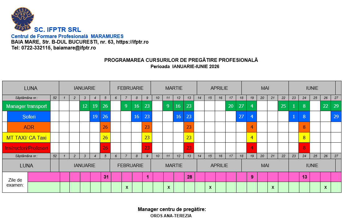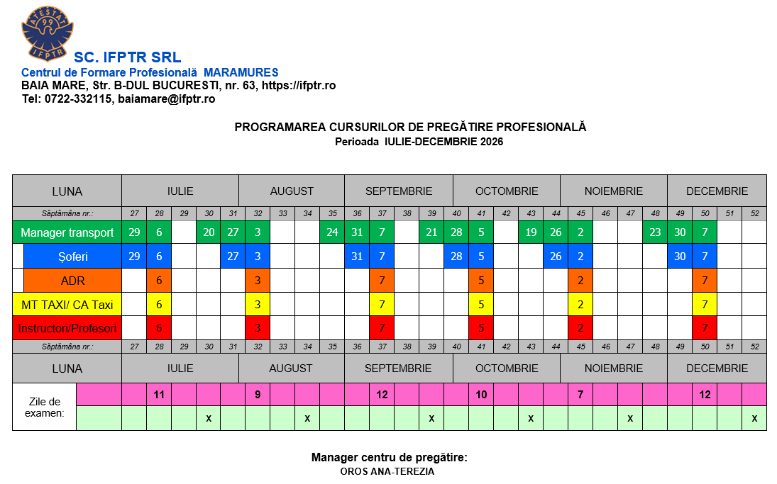 Centrul de Formare Profesională în Transporturi Rutiere IFPTR Maramureș organizează cursuri de pregătire profesională în vederea atestării profesionale în vederea desfasurarii urmatoarelor activități :